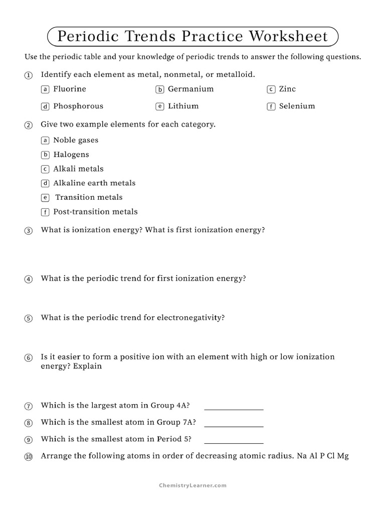 7) what trend in ionization energy occurs across a period on the periodic table? Compare the effects of atomic radius on the first ionization energy. These worksheets are meant to test your knowledge of the behavior of elements and the. Discuss the importance of mendeleev’s. Periodic trends tutorial 2 1.
